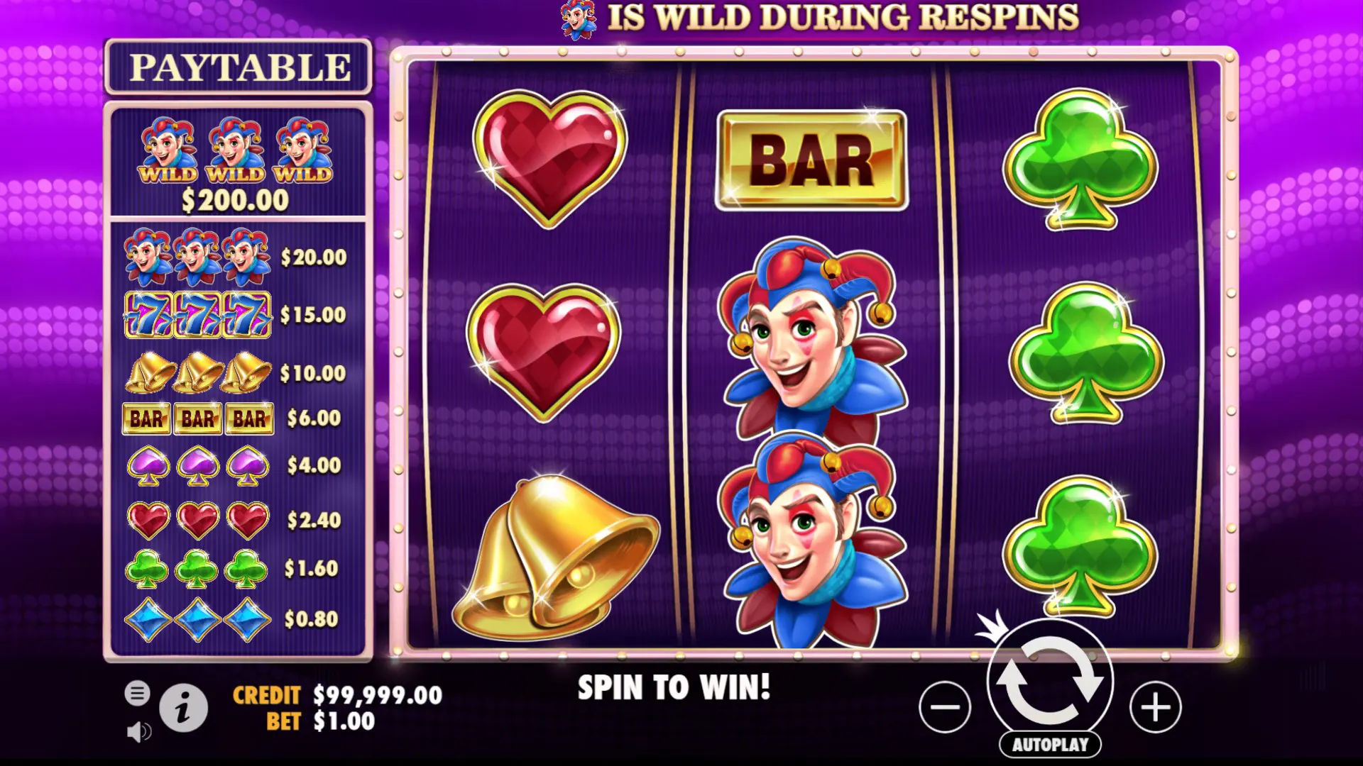 Re-spin Until You Win Feature is also notable in this game. If you fill all three positions in a reel with the joker symbol, you get to trigger this feature. The joker will turn into wilds and lock in position. The reels will keep spinning until they create a winning combo. If you land another stack of jokers, they will also turn into wilds and lock in position.