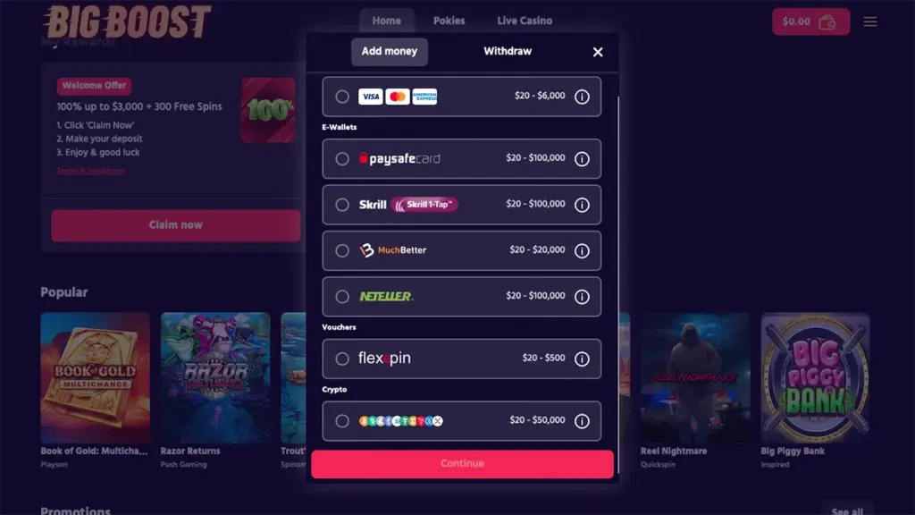 Players in New Zealand have the courtesy to use a variety of payment methods – banking cards, wire transfers, e-wallets, crypto, etc. Casinos have their own limits and terms, so we spent some time exploring the T&C of Big Boost. It turned out that depositing and withdrawing is quite easy!