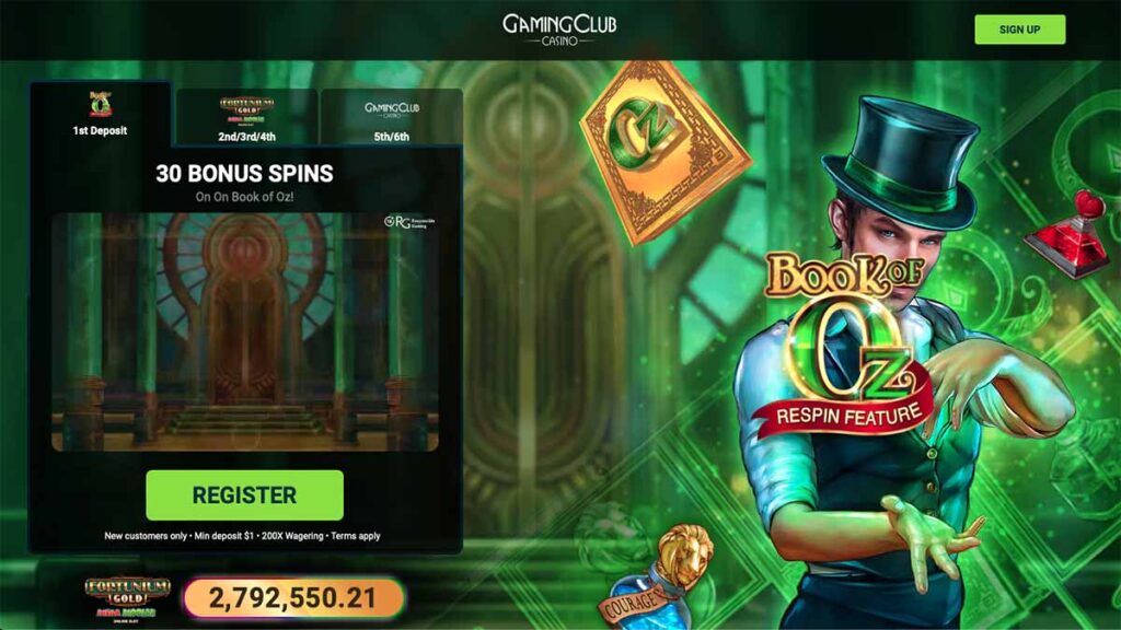 For Kiwi players invested in their online casino journey, but have limited bankrolls, this exclusive offer from GamingClub Casino is for you! Using the direct link provided below, players gain access to several unique offers; for just NZ$1 deposit, Kiwis receive 30 spins to use on Book of Oz, with another NZ$5 allocating 180 spins to use on Fortunium Gold Mega Moolah! Players using the link also gain access to a match bonus of 100% for up to NZ$350, with all of these bonuses attached with 200x wagering requirements.