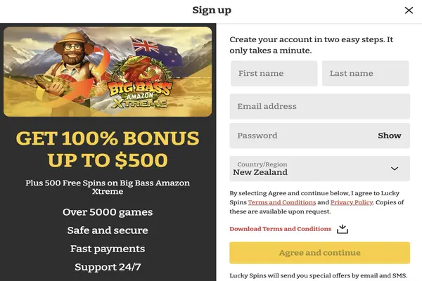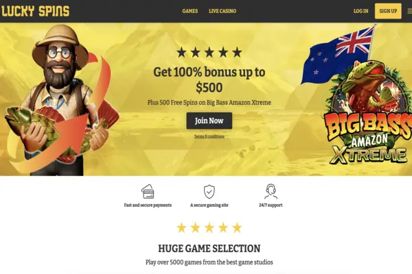 Lucky Spins is still relatively new among the NZ casino sites but manages to oppose its competitors by providing juicy welcome bonuses. In this particular case, newly signed members can claim a 100% deposit match up to NZ$500 and garnish it with 500 free spins on Reel Kingdom’s mega-hit Big Bass Amazon Xtreme.