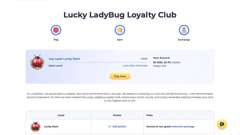 Lucky Start’s VIP program was under the name ‘Lucky LadyBug Loyalty Club’. This club was exclusive only to this specific platform and allowed all types of players to receive and win very valuable prizes. During our experience, this loyalty program consisted of 7 total tiers, where we could level up once we accumulated a certain number of points. Points could be received from simply placing bets and playing games across the online site, with the first level ‘Lucky Start’ being supplied to us, along with all new players, when signing up at Lucky Start. This first level also provided us with immediate access to the casino’s welcome package, with a total of 249 points needed to succeed in levelling up to ‘Lucky Start Enthusiast’.