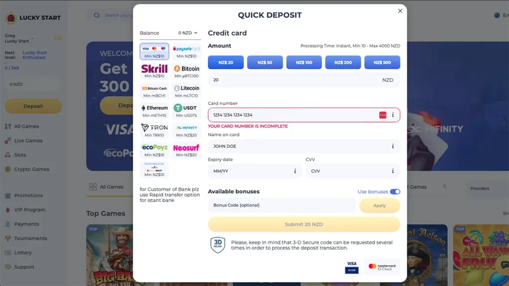 Each deposit and withdrawal option, when compared to other online platforms, came with a low minimum amount that we needed to meet prior to transacting. Lucky Start was no exception, with both deposits and withdrawals housing a minimum amount each; a minimum of NZ$10 was to be applied prior to a successful deposit, and a minimum of NZ$20 for all withdrawal methods before the transaction will be approved.