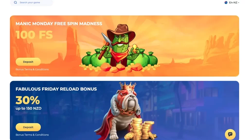 The first deposit in the welcome package provided a 100% match bonus for up to NZ$800, along with 150 free spins to use on Elvis Frog in Vegas: a popular pokies title by BGaming. The secondary deposit promoted a generous 50% match bonus for up to NZ$400, along with another set of 50 free spins to use on Wild Cash: another immersive title by the BGaming company. The third and final deposit allocated us another solid 50% deposit match for up to NZ$400, along with another 100 free spins to use on the pokies title Big Bass Splash by Pragmatic Play.