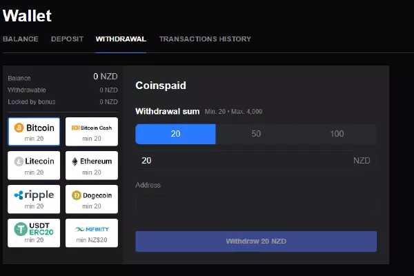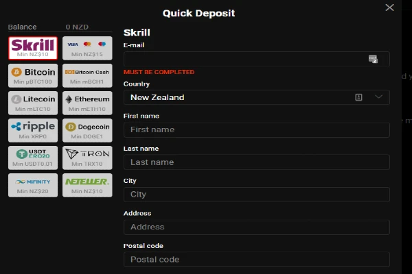 | Skrill | e-wallet | 2.5% | Instant | NZ$ 10 | NZ$ 4000 |