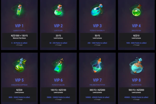- Second Deposit: 75% up to NZ$1200 / 1 BTC + 50 free spins, Bonus code W2.