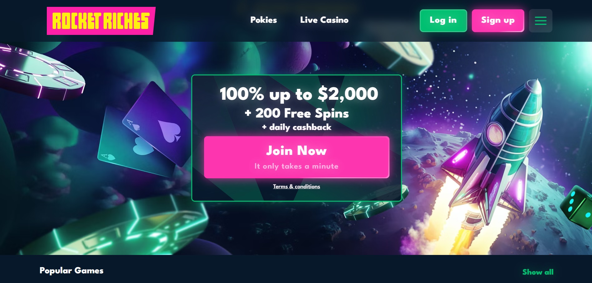 New players at Rocket Riches Casino start with a solid package: 200 free spins bundled with a 100% up to NZ$2000 deposit on a NZ$20 deposit.