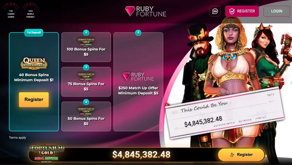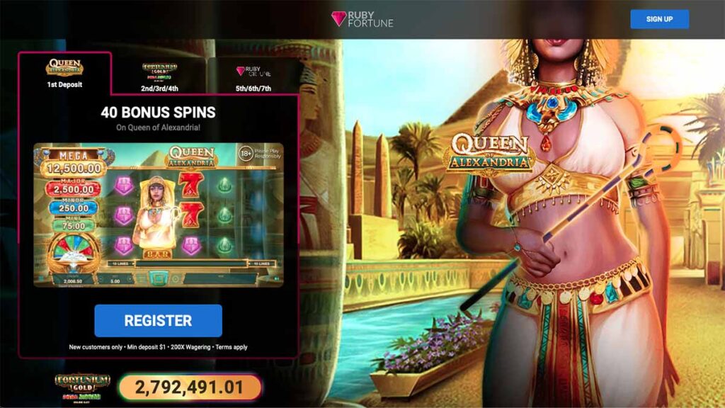 Kiwi players accessing Ruby Fortune using the exclusive link below have access to a generous offer. For a small deposit of just NZ$1, players receive 40 spins to use on the Queen of Alexandria game title. For a NZ$5 deposit, players receive an additional 225 spins to use on Fortunium Gold Mega Moolah. Players can also receive up to NZ$750, divided over three deposits of 100% match bonuses for up to NZ$250 each. These offers are all subject to 200x wagering requirements.