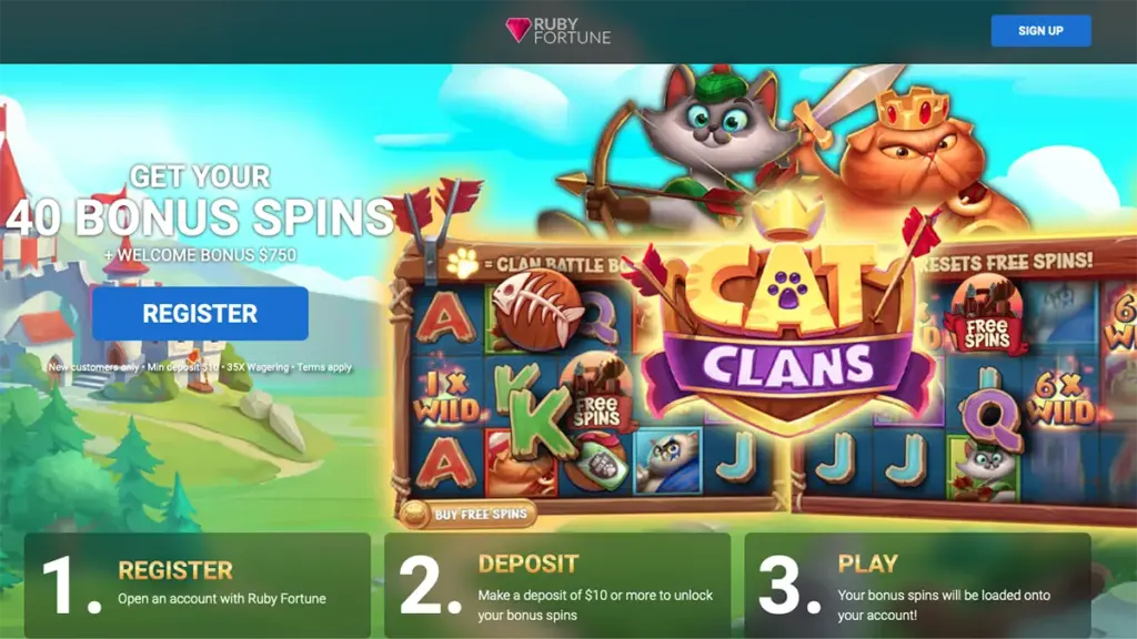 Players accessing Ruby Fortune Casino through the link here at New Zealand Online Pokies receive a very special offer. Upon your first deposit of up to NZ$250, matched at 100%, Kiwis also receive 40 free spins to use on the Cat Clans slot title. The second and third deposits also consist of 100% match bonuses for up to NZ$250 each, with the entire bonus subject to 35x wagering requirements.