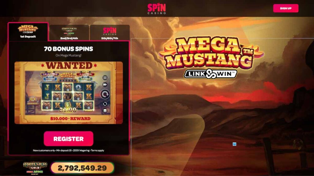 Looking for a bonus where you don’t need a large bankroll? This exclusive Spin Casino offer is definitely for you. New Zealand Online Pokies has provided a direct link for Kiwis to access special offers; for only NZ$1 deposit, players receive 70 spins to use on Mega Mustang. 2nd/3rd and 4th offers awaits, with a NZ$5 deposit you will secure 170 spins to use on Fortunium Gold Mega Moolah. An additional bonus 100% up to NZ$1000, divided into NZ$400, NZ$300, and NZ$300, is also up for grabs. The spins and bonus money are all subject to 200x wagering requirements, so keep this in mind prior to withdrawing any winnings!