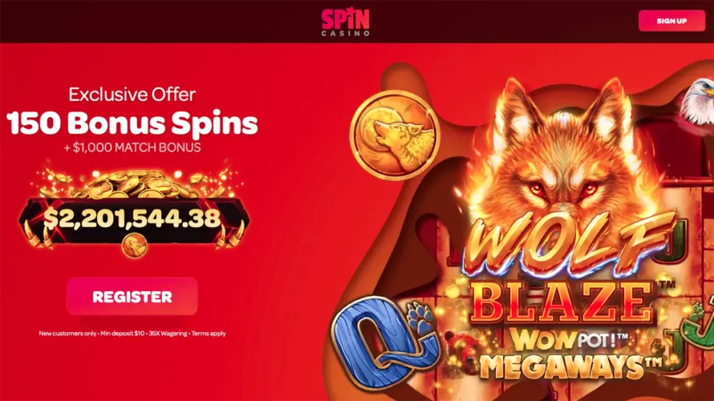 Are you a fan of Spin Casino promotions? Then this new offer is for you! Exclusively to visitors at New Zealand Online Pokies, Kiwis using the link below gain access to 150 bonus spins to use on Wolf Blaze WOWPOT! Megaways slot title. In addition, players receive up to NZ$1000 in bonus cash, with three different deposits providing 100% match bonuses up to NZ$400, NZ$300, and NZ$300 respectively. The spins and bonus cash are subject to 35x wagering requirements.