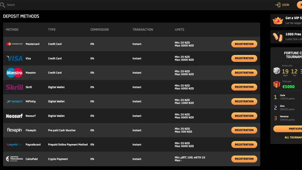 | Skrill | eWallet | Instant | NZ$20 |