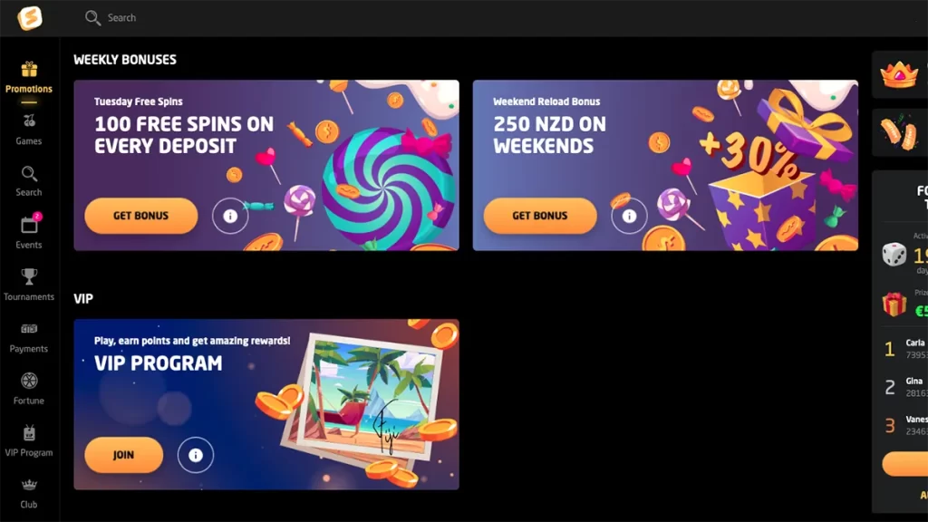 | Lottery | Purchase a lottery ticket with 1 ticket = 25 free spins | Based on deposits | 20 winning tickets, 1 ticket for each NZ$45 deposited, total prize pool of 1000 free spins |