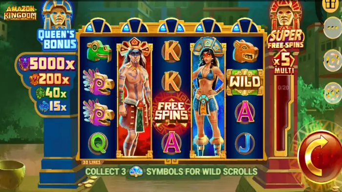 Amazon Kingdom comes with a wide grid of 5 reels, 4 rows, and 30 standard lines, paying from left to right and starting from the far-left column. Above each reel is placed a Bonus Holder, which requires 3 Bonus Symbols to activate. On the left side, you’ll see the Queen’s Jackpots, while on the right – the Super Free Spins meter.