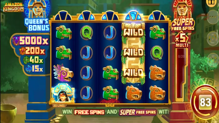 Amazon Kingdom is heavily packed with reel modifiers and special features. Wild Scrolls turn into Sticky Expanding Wilds, and Queen’s Bonus awards great jackpots. The cherry on the cake is the Free Spins and Super Free Spins minigames.