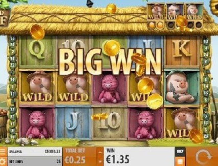 There are a variety of symbols that are relative to the story such as the three pigs, a beehive wild symbol, a wolf scatter, a full moon (bonus round only), a pig teddy, and card value symbols that range from A to 10.