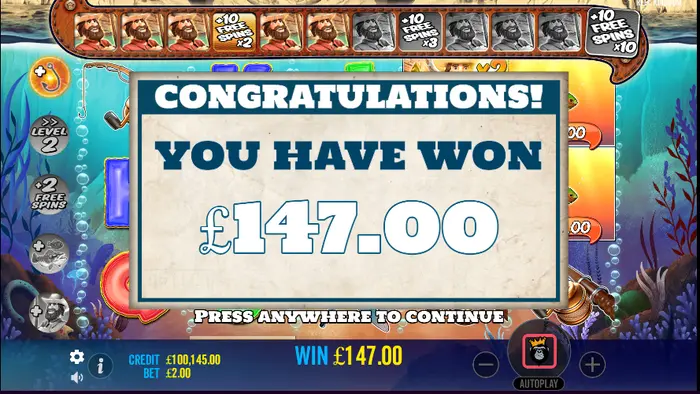 Three, four, or five scatters award 10, 15, or 20 free spins and 0 to 5 special modifiers. Free Spins is played with a Bonus Trail as well, and all wild Fishermen are collected there. The 4th, 8th, and 12th Fisherman awards 10 extra free spins and increases the win multiplier to 2x, 3x, and 10x, respectively.