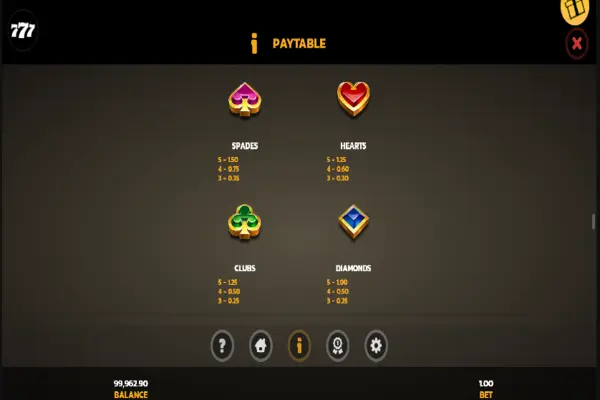 | Hearts Suit | 3, 4, or 5 pay 0.30x, 0.60x, or 1.25x the bet |