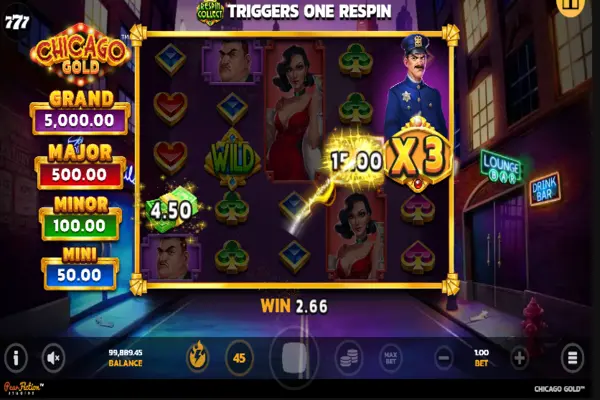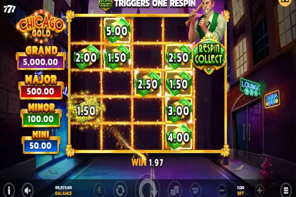 Scatters on reels 1, 3, and 5 at the same time award 8 Chicago Gold free spins, and the bonus can be retriggered in the same way. During the minigame, more Cash, Collect, and Jackpot symbols are added to the reels. The bonus potential is 5,000x the wager!