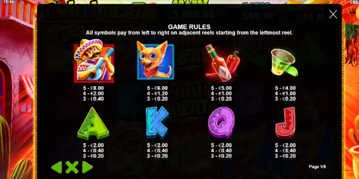 Symbols on the grid are not too many, and the Paytable includes 4 high-valued characters, with the Mexican Mariachi paying the most – up to 8x the total bet. Chihuahua, Chilli Sauce, and Tequila Shot follow with top prizes of 6x, 5x, and 4x the bet, respectively. All symbols in the game pay for 3 to 5 matches on a line.