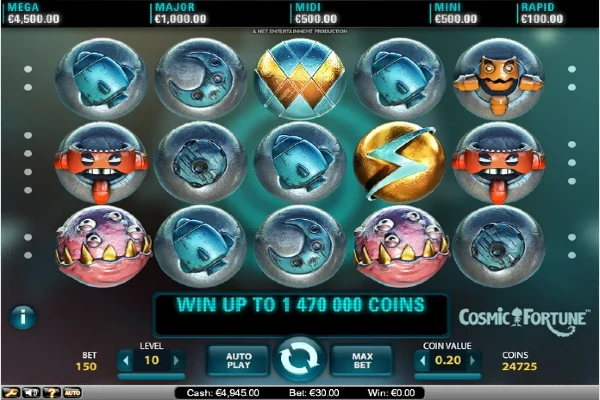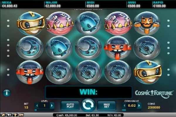 Cosmic Fortune features a progressive jackpot system that consists of five different jackpots, each one more lucrative than the last. Here you’ll find the Rapid, Mini, Midi, Major, and Mega. The Mega Jackpot is the one that you’ll want as it provides you with the highest payout.