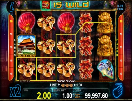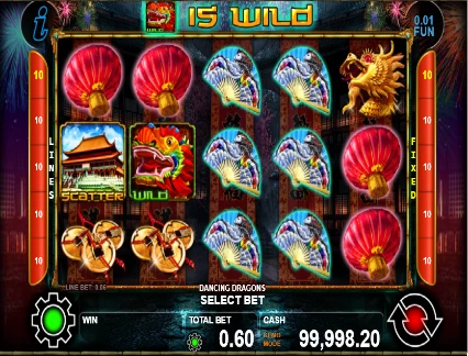 Dancing Dragons incorporates a design filled with modern Chinese elements tied to the Chinese New Year holiday. The background takes place on the streets with fireworks going off in the background. A thin bamboo border surrounds the grid, with the number of paylines displayed on either side. The bottom of the screen displays the betting options along with the spin button and the menu.