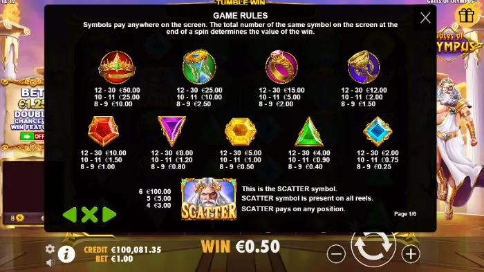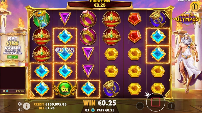 Gates of Olympus uses Pay Anywhere mechanics, and you’ll win every time 8 or more symbols of a kind are presented on the grid. The payout system also features Tumble wins.