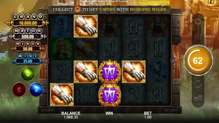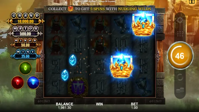 Kings of Crystals comes with exciting base gameplay on 5 reels, 4 rows, and 40 fixed paylines. They are orientated from left to right and always start from the far-left reel. Multicolored Crystal Crowns may land as scatters on any position and contribute to the respective meters displayed under the fixed jackpots to the left.