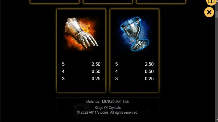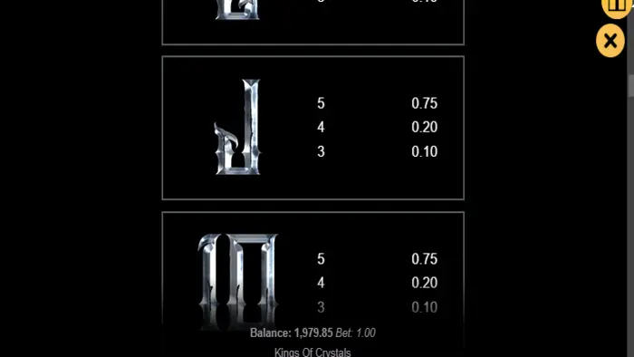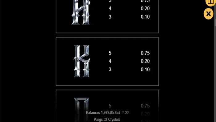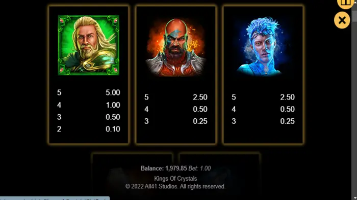 Kings of Crystals stands out with amazing artwork and attention to detail, especially when we look at the Paytable. Each symbol looks like a masterpiece, even the low-valued card royalties and numbers. Although the provider doesn’t mention it in the game’s memo, all symbols, including the Wilds, often land in stacks.