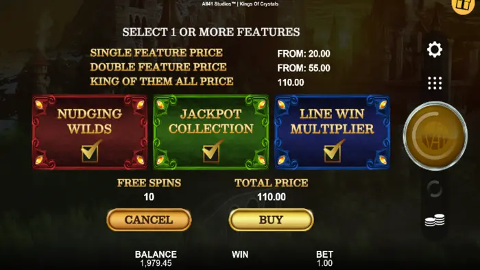 The Kings of Crystals Bonus Buy allows an instant trigger for the bonus and various combinations. Think twice before paying the displayed price: