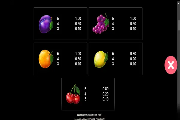 | Plum | 3, 4, or 5 pay 0.10x, 0.30x, or 1x the bet |
