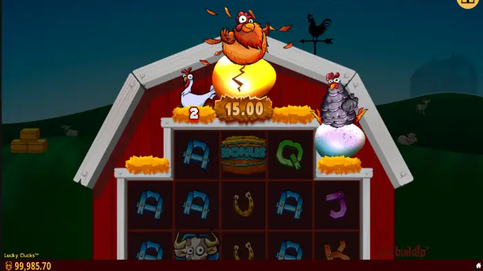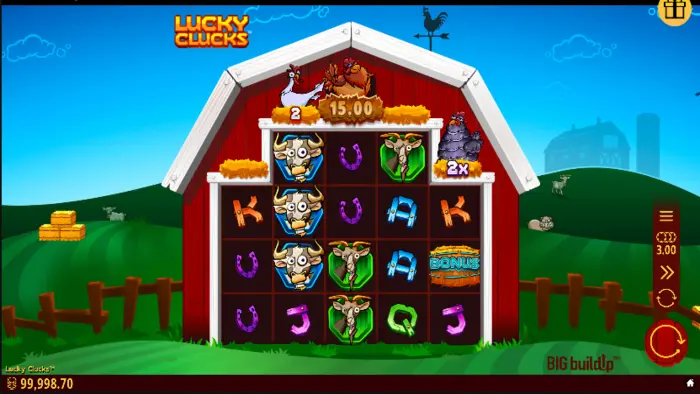 White Hens carry wild symbols, while the Gray Hens carry potential win multipliers from 2x to 5x. Corn symbols add a value of up to 10x the bet to the Mother Hen Prize, which can be anywhere from 5x to 3,000x. The BIG BuildUp feature is actually active during the whole time but stays in an accumulation phase.