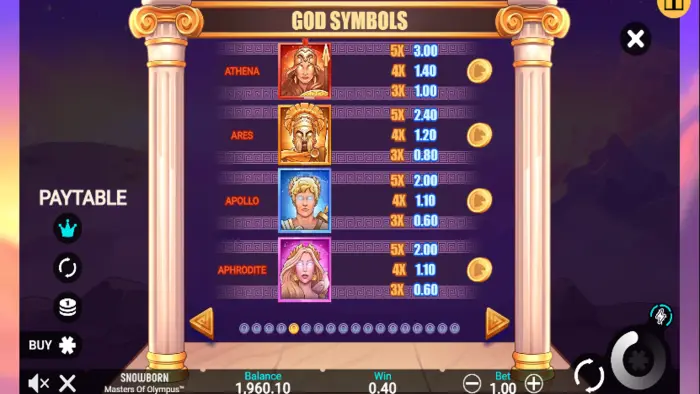 The Masters of Olympus Buy Shop provides 3 options at the following prizes: 50x, 100x, and 250x the bet. They will instantly trigger the Olympus Bonus, Spartan Bonus, and Spartan Bonus with a guaranteed Athena, respectively. Bonus Buy may not be available across all casino platforms.