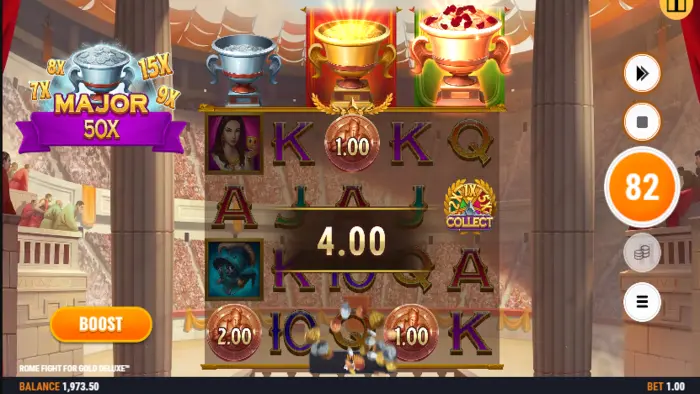 Rome Fight for Gold Deluxe offers a Collect feature with Coin prizes of up to 50x the bet each. The bonus minigame can pay up to 20,000x the stake!