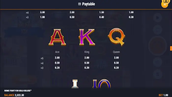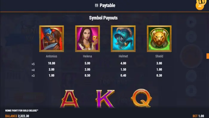 Despite being beautifully designed, symbols in the game do not stand out in a unique way. Antonius and Helena are the top-paying characters, followed by a helmet and chest armor. They pay 10x, 5x, 4x, and 3x the bet, respectively, for five a kind on an active payline.
