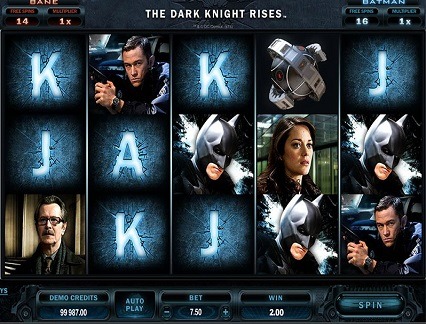 Apart from standard playing symbols including ace, jack, queen and king playing card symbols, the Dark Knight also features significant icons or characters from the blockbuster movie including: The Joker, Commissioner Gordon, Bruce Wayne, Harvey Dent, Lau, Rachel, Maroni and of course the Batman symbol.