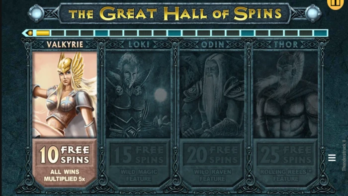 Besides paying hefty cash wins, three or more scatters in view grant entrance to the Great Hall of Spins. It contains 4 modes, with the first one unlocked, and the other 3 will be revealed while the saga unfolds. Loki activates from the 5th Free Spins trigger, while Odin and Thor – from the 10th and 15th bonus triggers, respectively.