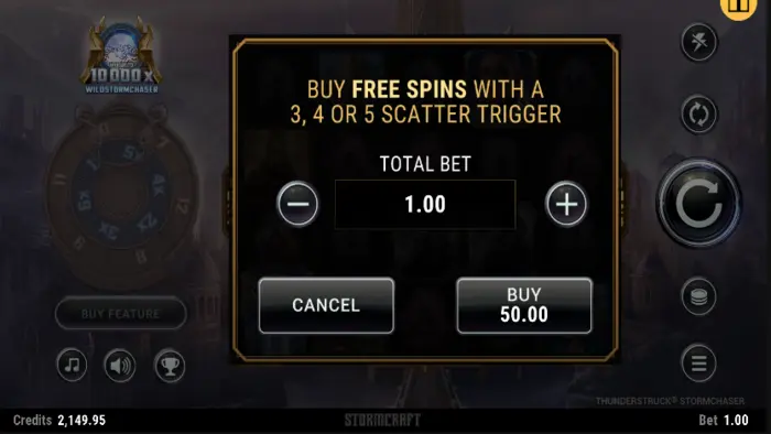 The Thunderstruck Stormchaser Bonus Buy is first locked and can be used after the first Free Spins activation or after 100 paid spins. The bonus frequency is relatively high, so it’s more likely to activate before the 100th round. Bonus Buy offers 3, 4, or 5 scatters on the following round and costs 50x the wager!